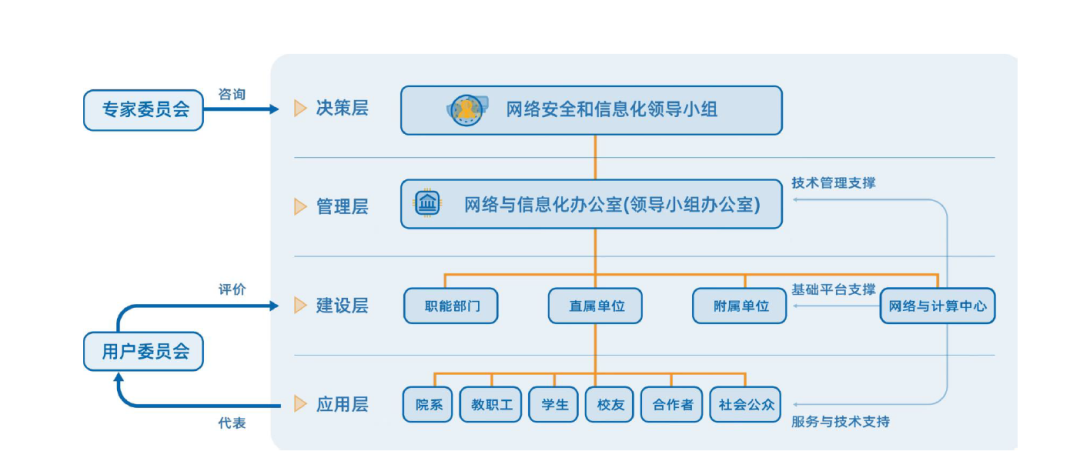 为推进学校教育数字化,学校先后出台了《华中科技大学“十四五”信息化发展规划》《华中科技大学关于加强新时代网络安全和信息化工作的意见》,重新修订了《华中科技大学网络安全和信息化工作管理规定》《华中科技大学网络安全和信息化技术管理规定》《华中科技大学网络安全和信息化项目管理办法》,建立了科学有效的信息化管理机制、畅通高效的工作网络、实时响应的信息化建设运行管理与维护体系,形成网信领导小组决策、专家委员会指导咨询、网络与信息化办公室统一管理、各部门共建共享、网络与计算中心技术支持、用户委员会参与评价、各单位及师生广泛应用的信息化工作机制(图1)。